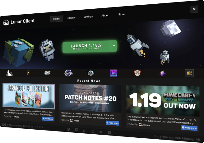 Lunar Client supports all of the latest versions of the game. You can easily switch between playing on 1.8 to playing on 1.19 at the click of a button, with compatibility for all your favorite mods.